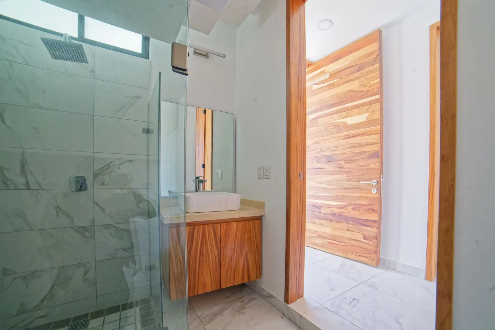 PISOS INTERIORES Y AZULES: Pisos de poercelanato 60x60 cms., azulejo debaños en porcelanato 30x60 cms., jabonera de regadera hecha con unacombinación de azulejo vidriado y piedra natural.