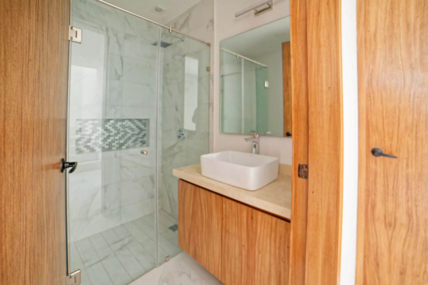 PISOS INTERIORES Y AZULES: Pisos de poercelanato 60x60 cms., azulejo de baños en porcelanato 30x60 cms., jabonera de regadera hecha con una combinación de azulejo vidriado y piedra natural.